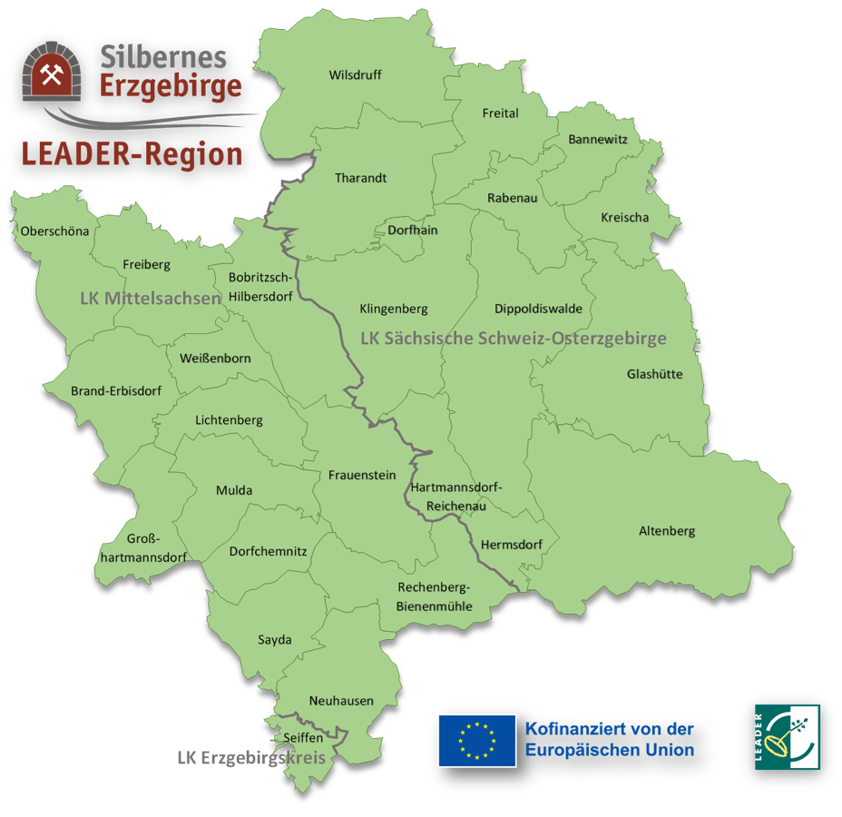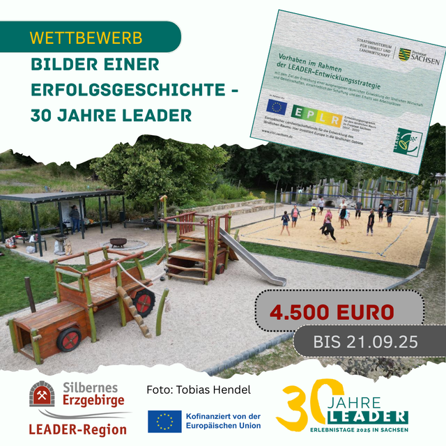 Wir suchen die meisten und die besten Fotos von Gebäuden und Plätzen, welche in den Förderperioden LEADER, LEADER+ und ILE mit Hilfe der europäischen Fördermittel in unserer Region “Silbernes Erzgebirge” entwickelt wurden. Begeben Sie sich auf die Suche nach den Schildern, die auf die Förderung hinweisen und senden Sie uns diese unter Angabe Ihrer Kontaktdaten und der Adresse des fotografierten Objektes bis zum 21.09.2025.