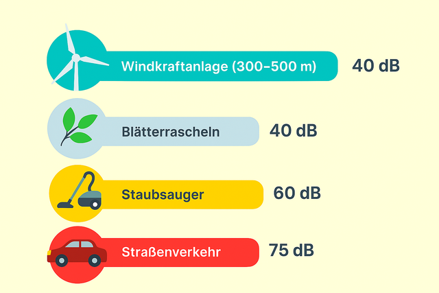 Windenergieanlagen (WEA) erzeugen Infraschall durch die Bewegung der Rotorblätter. In einer Entfernung von 150 Metern ist der Schalldruckpegel bereits niedriger als der im Inneren eines PKW – also deutlich unter alltäglichen Belastungen.