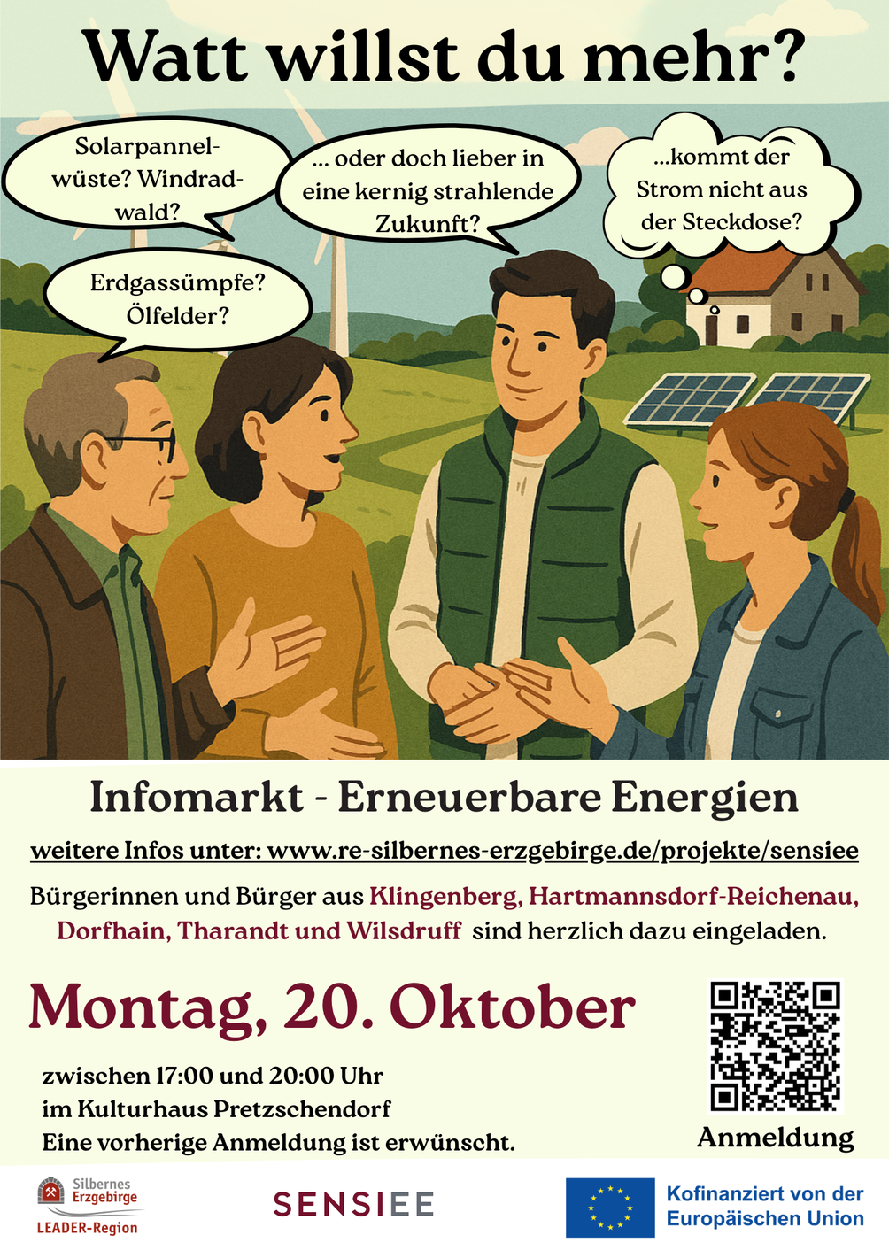 Am 24.04.2024 fand in der LEADER-Region „Silbernes Erzgebirge“ die Fachveranstaltung „Lokale Wertschöpfung durch regenerative Energien“ statt. Aus den Diskussionen entstand der Wunsch, ein Informationsprojekt für die Bevölkerung ins Leben zu rufen.