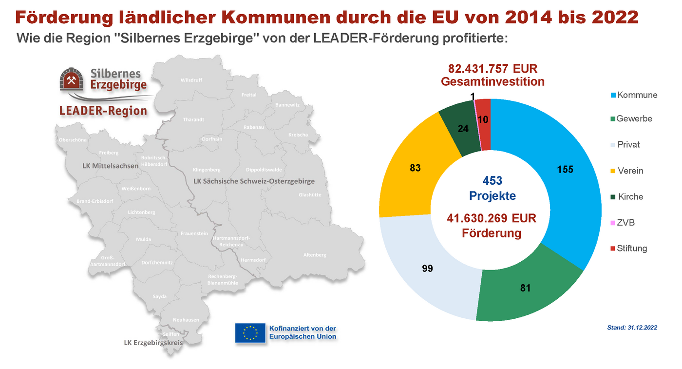 Die Region „Silbernes Erzgebirge“ erhielt in der vergangenen Förderperiode von 2014 bis 2022 ein Budget von rund 44 Mio. Euro. Damit wurde u.a. das Projekt „Kunst im Kirchenraum – Kleine Kunstführer zu Sakralbauten im Kirchenbezirk Freiberg“ gefördert. Im Rahmen des LEADER-Programms wurden 80% der Gesamtkosten übernommen. Die Blockline ist ebenfalls ein von LEADER gefördertes Projekt. Es erstreckt sich in unserer Region über 9 Gemeinden. Die Blockline wurde mit über 1 Mio. Euro gefördert.
